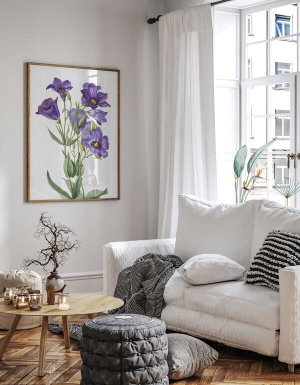 Paveikslas: Dvi šakelės violetinių eustomos žiedų su žaliais lapais.