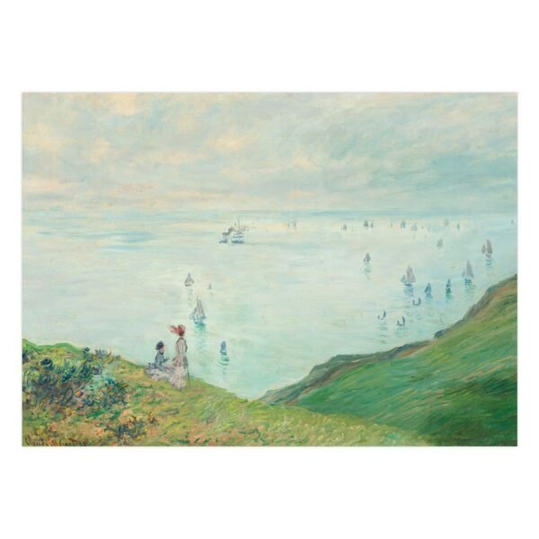 Paveikslas: Vaizduojamas atsiveriantis kraštovaizdis nuo uolų viršaus į vandenyną. Pastelinės mėlynos spalvos vandenyje plaukioja daug burlaivių. Nuo uolų viršaus į juos žvelgia dvi moterys.